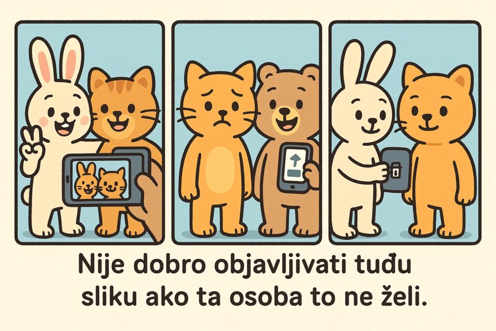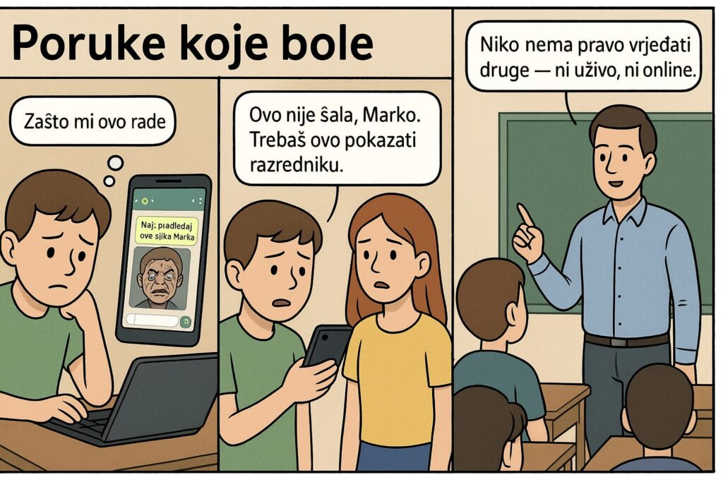 - forum: Analiza slučaja kroz strip – ovdje je bilo ponuđeno 5 situacija koje je trebalo prikazati kroz strip, mi smo jednu zajedno odradili (Zajednička fotografija – kad netko ne želi da mu se objavi fotografija na Internetu) i jednu je Marija Karaman sama napravila (Cyberbulling).