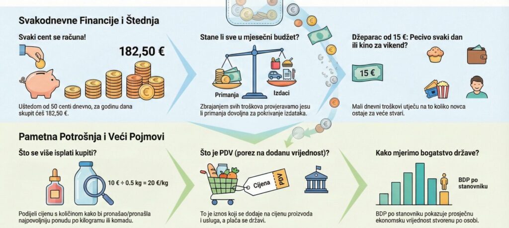 Siječanj-ožujak: stariji učenici su tijekom nastave iz informatike (kad su imali slobodno vrijeme) u wordu napravili zadatke i poleđine za kartice, koje smo onda printali, plastificirali i rezali te su tako nastale naše nove karticu za igru. Ploču za igru nismo mijenjali jer nam se sviđa ova postojeća. Također su uz pomoć pametne inteligencije napravili nekoliko infografika na temu financijske pismenosti od kojih neke smo odabrali i stavili na web stranicu škole.