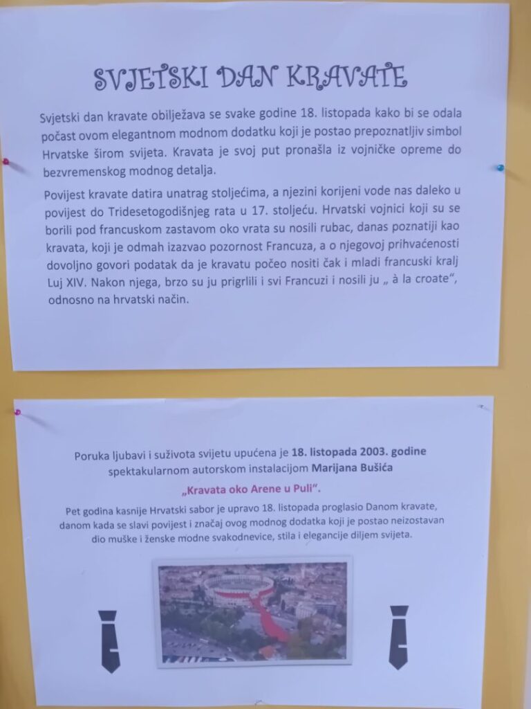 Dana 17. listopada 2025. godine u našoj školi na poseban je način obilježen Svjetski dan kravate, dan posvećen simbolu elegancije, dostojanstva i hrvatske kulturne baštine. Kravata, kao modni dodatak s hrvatskim korijenima, ovim je povodom postala središnji motiv kreativnih aktivnosti učenika svih razreda.