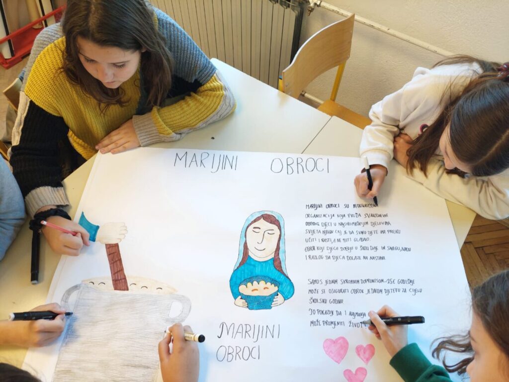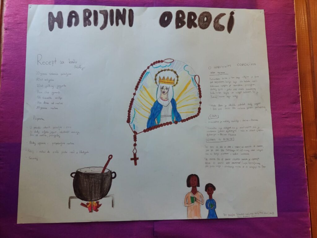 U sklopu projekta „Marijini obroci”, učenici 6. i 7. razreda sa vjeroučiteljicom Marinkom Žolo Marunica istraživali su rad humanitarne organizacije Marijini obroci koja pomaže djeci diljem svijeta osiguravajući im svakodnevni školski obrok. Kroz istraživački rad učenici su saznali više o tome gdje djeluju Marijini obroci, kako se organizira priprema hrane te što djeca u tim školama najčešće jedu.